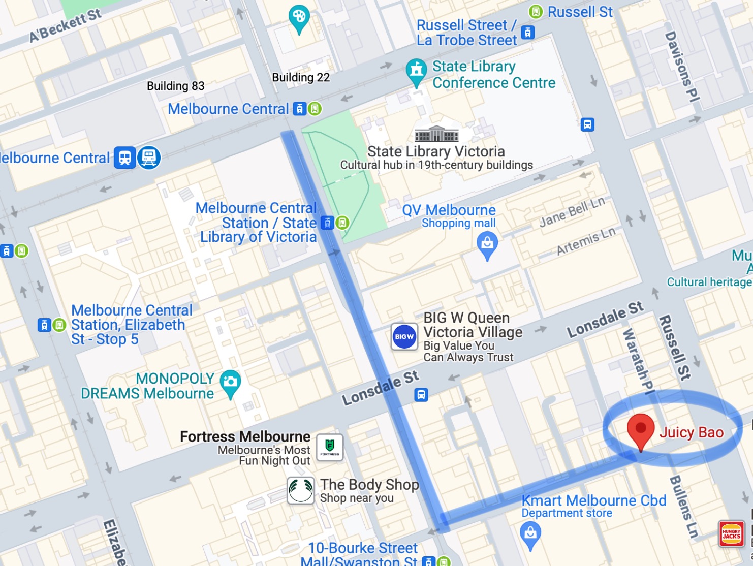 Melbourne Central 역에서 차이나타운까지 거리가 가까워서 가게까지도 오래 걸리지 않습니다. 걸어서 약 7분 거리에 있습니다. 트램으로 딱 1 정거장 거리여서 마침 트램이 눈앞에 있으시다면 타도 좋겠지만, 그렇지 않다면 기다려서 트램을 타는 시간이 더 오래 걸릴 수 있기 때문에 걸어가시는 걸 추천해 드립니다. Melbounre Central 역에서 큰길을 따라 쭉 내려오다 보면, 내려오는 방향을 기준으로 왼쪽에 굉장히 큰 중국식 대문(?)이 있습니다. 그곳이 차이나타운 입구입니다. 안쪽으로 큰 길이 나오기 전까지 걸으시다 보면 왼쪽에서 가게를 찾으실 수 있습니다.