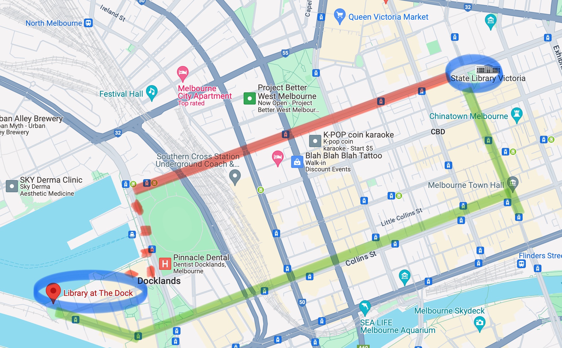 1. Melbourne Central에서 30번 트램을 타고 Central Pier/Harbour Esp(Docklands)에서 내려서 걸어가기 : 주립 도서관 옆에 있는 트램 역에서 30번 트램을 타신 후 걸어가는 방법입니다. Melbourne Central 역에서 Central Pier 역까지 6 정거장, 약 10분이 걸립니다. 트램에서 내린 후에 야라 강물을 오른쪽으로 두고 쭉 내려가다가 오른쪽으로 돌아서 걸어가면 도서관에 도착합니다. 가는 길에 Marvel Stadium도 볼 수 있고, 길 자체도 굉장히 예뻐서 걷는 걸 좋아하신다면 이렇게 가는 것도 추천해 드립니다. 다만 생각보다 거리가 짧지는 않으니 너무 많이 걸으셨거나 다리가 아프시다면 두 번째 방법으로 가시는 것이 나을 듯합니다.