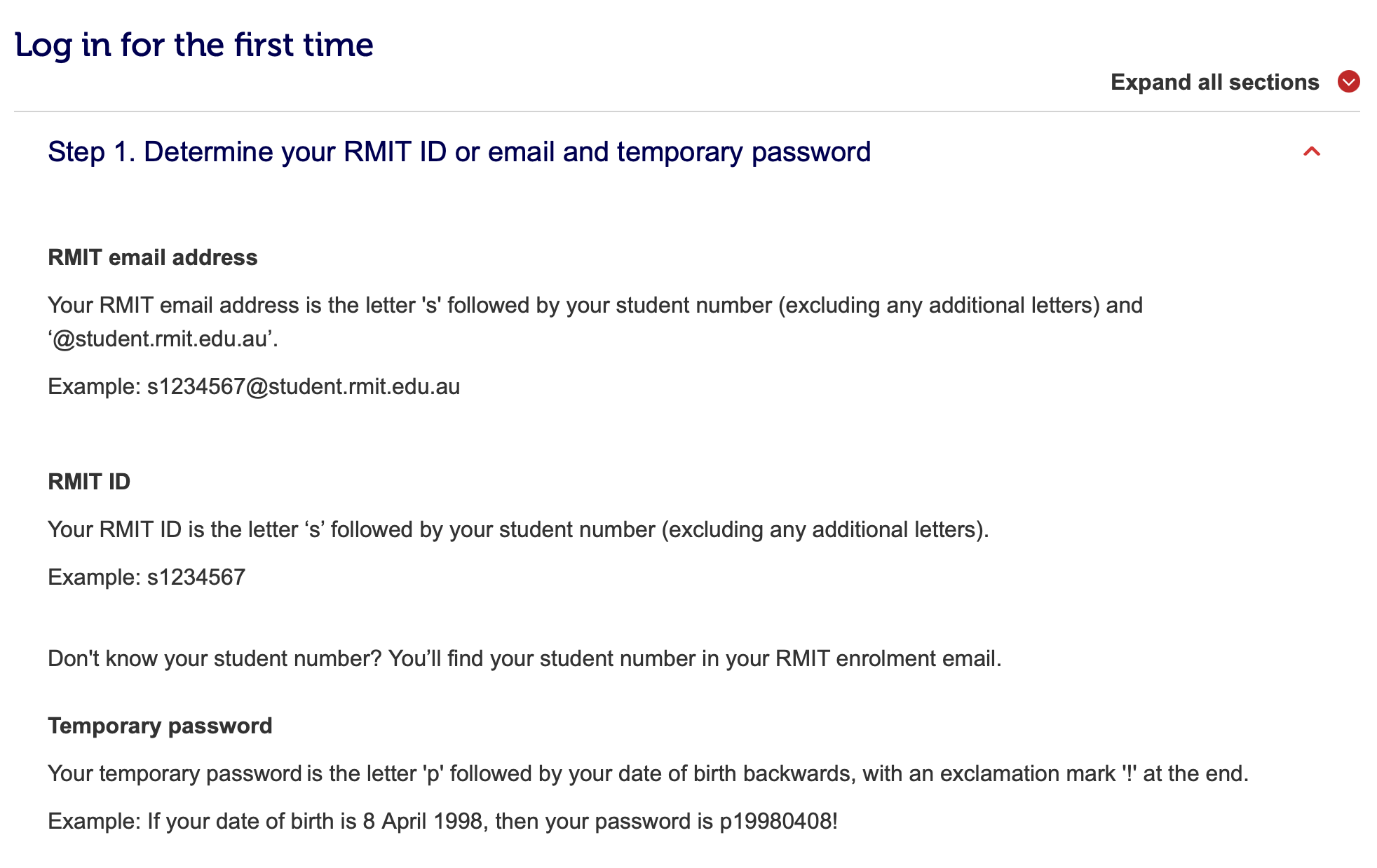 메일에 RMIT account 도움말 사이트의 링크를 보내 주는데요, 접속해서 Log in for the first time 탭을 열어 보시면 위 이미지와 같이 적혀 있습니다. RMIT account, 즉 RMIT ID는 자신의 student number 맨 앞에 s를 붙여 's◯◯◯◯◯◯◯'의 형식으로 이루어져 있고, RMIT email 주소는 's◯◯◯◯◯◯◯@student.rmit.edu.au'의 형식으로 이루어져 있다고 되어 있습니다. 저는 맨 처음에 student number를 찾지 못해서 고생을 많이 했습니다. RMIT enrolment email이 뭘 말하는지 몰랐거든요. 결론적으로 어디서 찾았냐면